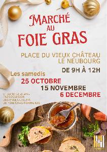 Les marchés au foie gras reviennent au Neubourg ! Ils auront lieu en centre-ville, sur la place du vieux château où les producteurs de foie gras normands se réunissent pour vendre foie gras frais, foie gras au torchon, terrine, magrets, confits, saucisses de canard... À 9h30, c’est le tintement de la cloche qui donne le signal pour l’ouverture du marché où aucune transaction ne peut être effectuée avant ce rituel. Le chef du restaurant Le Logis de Brionne sera présent pour éveiller vos papilles et vous donner des idées recettes.